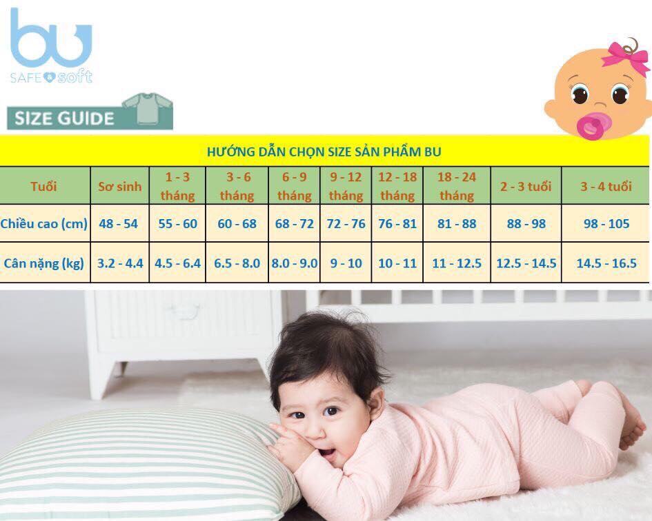 Size quần áo BU được sản xuất theo chuẩn tăng trưởng của bé nên mẹ chọn đúng size là vừa vặn thoải mái