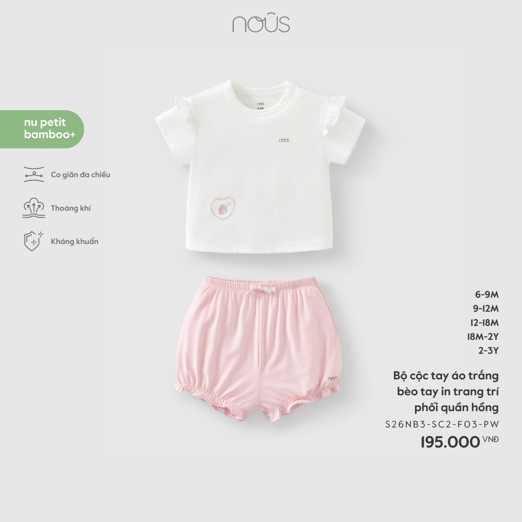 NOUS - Bộ cộc tay áo trắng bèo tay in trang trí phối quần hồng - 18-24M - SS26.T3A