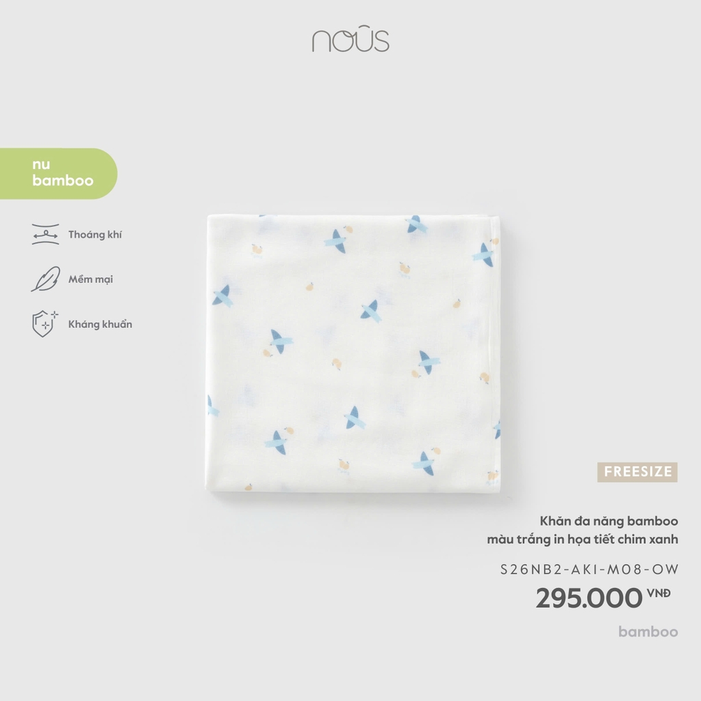 NOUS - Khăn đa năng bamboo màu trắng in họa tiết chim xanh - FS - SS26.T5A